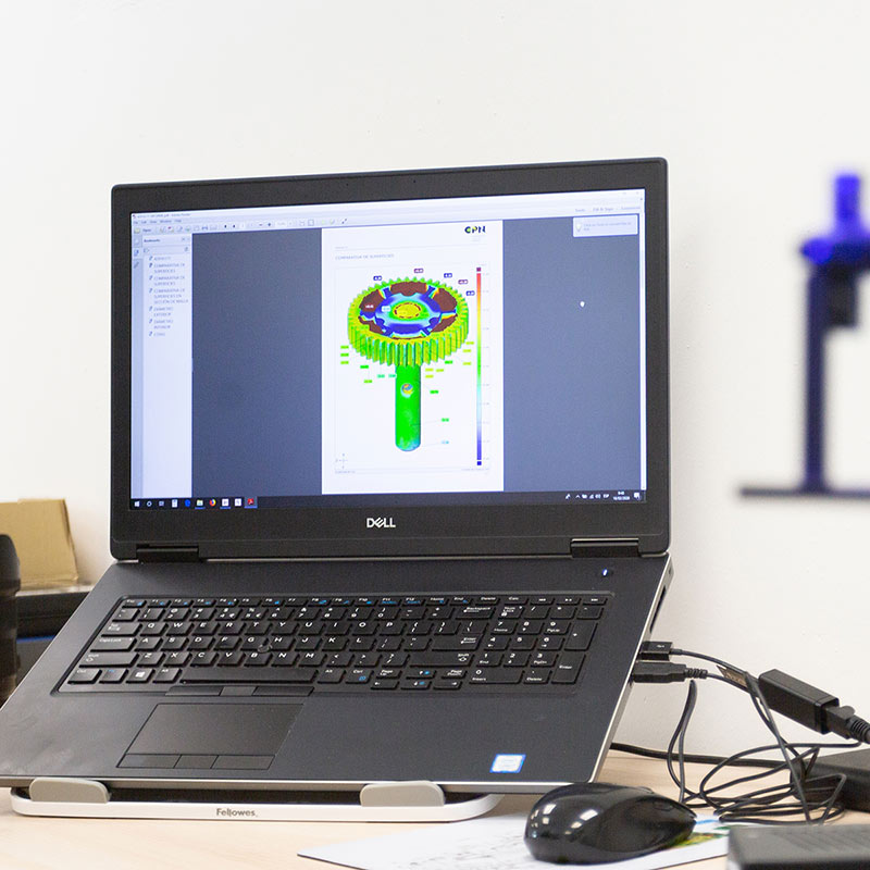 Mediante el escaneo se generan nubes de puntos que se unen en pequeñas superficies triangulares formando así una malla en formato STL. Esta malla define las superficies y geometrías de la pieza, pudiéndola comparar directamente con el archivo CAD del componente y analizar formas y dimensiones.